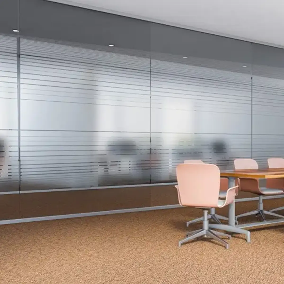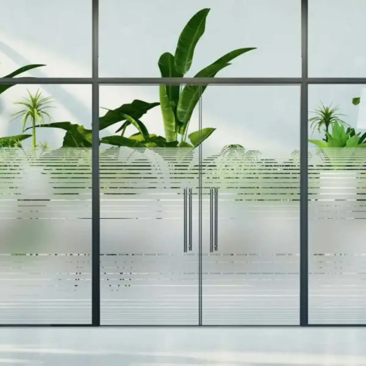 Η μεμβράνη INT 560 διαθέτει οριζόντιες ρίγες που αλλάζουν σταδιακά πυκνότητα, προσφέροντας ιδιωτικότητα στο κατάλληλο ύψος χωρίς να βαραίνει το γυαλί. Ιδανική για γραφεία και χώρους υποδοχής.